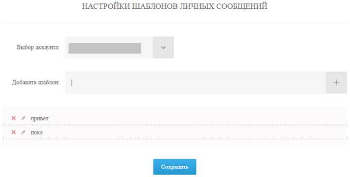 В настройках «Шаблоны сообщений» вы выбираете аккаунт и вбиваете все нужные вам шаблоны сообщений.