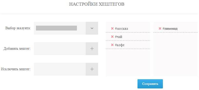 - Отслеживание заданных вами хэштегов. Можете задать не только нужные хэштеги, а также ввести и исключения.