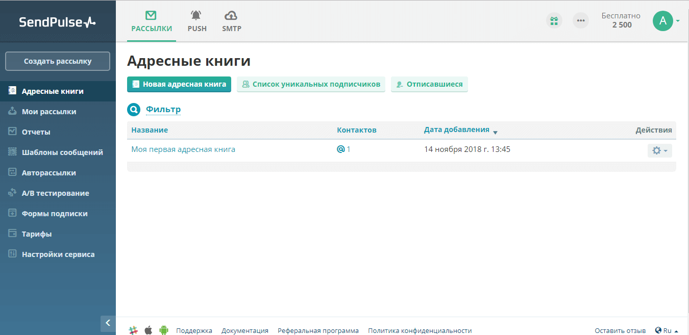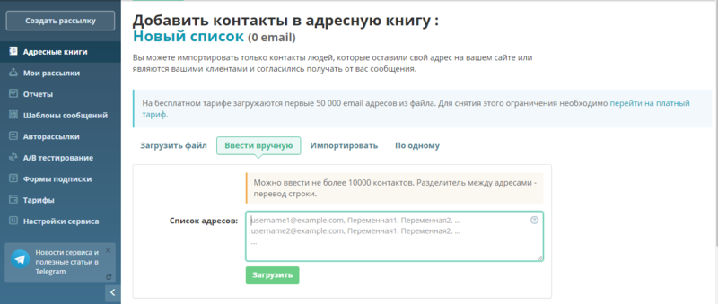 Дальше нужно будет добавить базы данных ваших пользователей. Для этого нужно будет в левом блоке сайта перейти по вкладке “Адресный книги”. Здесь создаем название списка и вводим/загружаем адреса контактов.