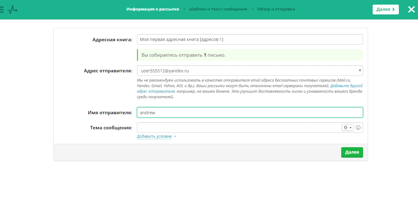 В первом окне, необходимо ввести информацию о рассылке: тему сообщения, имя отправителя и т.п.