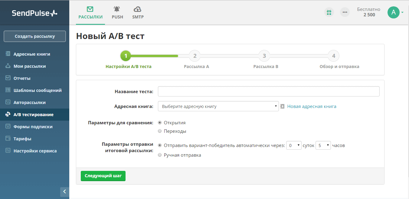 Далее создаем саму рассылку, соответственно кликая по иконке “Создать рассылку”. Для отправки письма предстоит выполнить несколько шагов.
