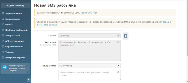 Для начала рассылок достаточно кликнуть по иконке “Создать смс”. Откроется новая страница, где нужно будет ввести имя отправителя, текст сообщения, получателей и выбрать дату отправку.