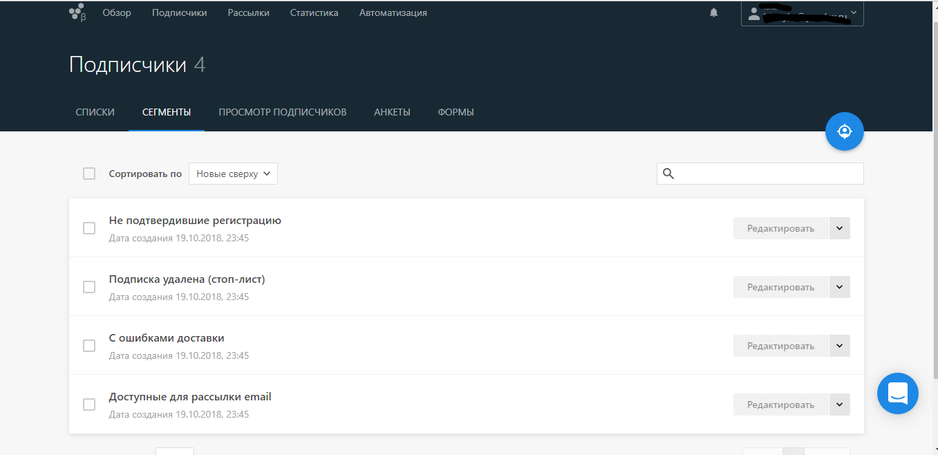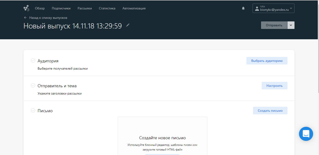 Чтобы начать саму рассылку переходим по вкладке “Рассылки”, также нажимаем на плюсик и создаем форму письма. Здесь выбираем нужный сегмент аудитории и имя/адрес отправителя.