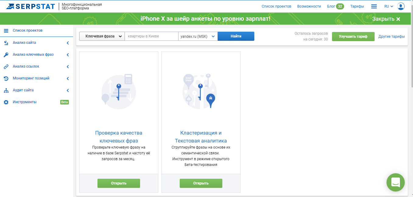 Serpstat - это мультиплатформа с большим набором инструментов для эффективного SEO продвижения сайтов. При помощи функционала сервиса вы сможете анализировать свои и чужие сайты, находить ключевые фразы, расширять семантику своего интернет ресурса.