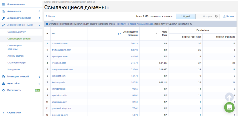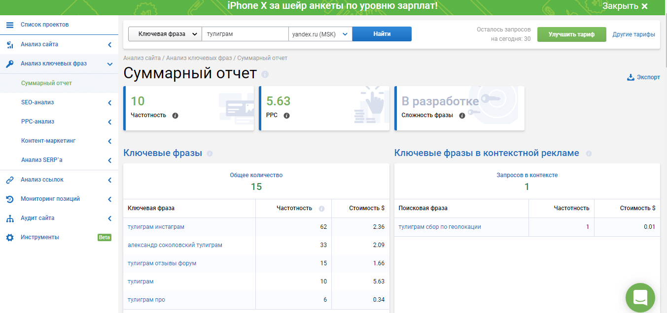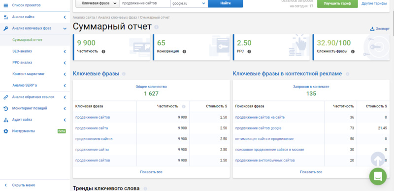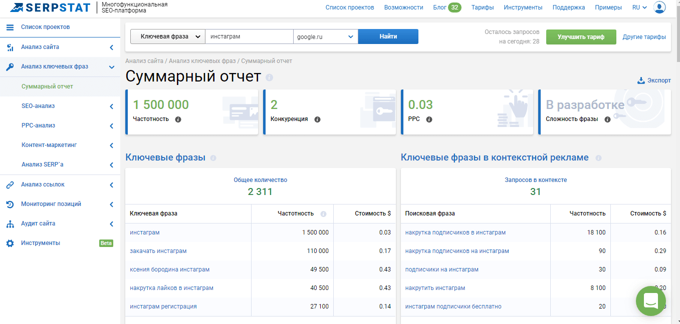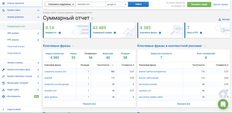 Так как площадка имеет большое количество инструментов для анализа и сбора информации по сайтам, рассмотрим самые главные из них.