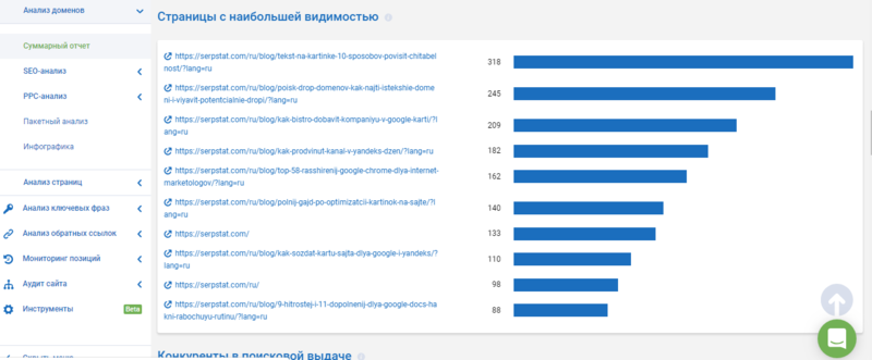 Если пролистать ниже, то вы увидите диаграммы с показателями видимости сайта, распределение фраз по позициям и т.п. Например, можно увидеть страницы сайта, которые привлекают больше всего трафика из поисковых систем.