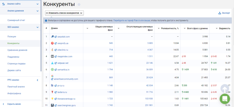 Далее вам покажут всех конкурентов по схожей с вами тематике. В первую очередь — это те сайты, которые занимают высокие места в поиске по таким же фразам, как у вас. Здесь можно увидеть общие ключевые запросы и их релевантность. Но самое интересное это отсутствующие фразы, вы можете скопировать их к себе, чтобы получить дополнительные ключевые запросы.