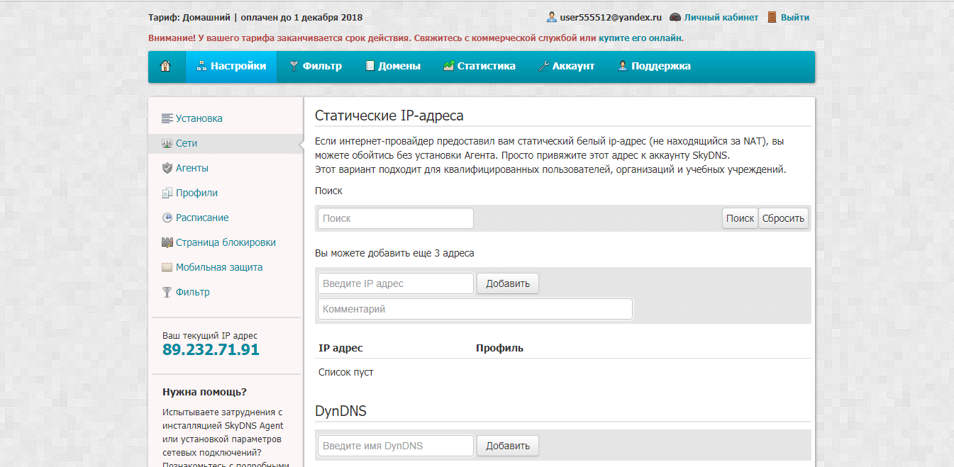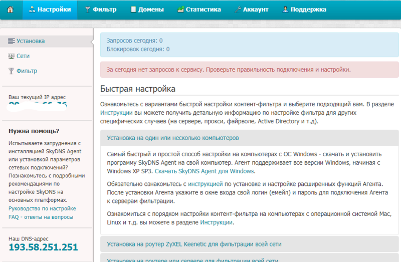 Для доступа к функционалу сервиса нужно будет пройти регистрацию на сайте компании и выбрать тариф. Вам будет доступно 15 дней бесплатного пользования для тестирования любого платного тарифа, после чего ваш аккаунт перейдет на FREE. После этого получаем инструкции по установке и настройке сервиса на ваши устройства. Самый быстрый способ - это установить на свой ПК SkyDNS Agent. А на маршрутизаторе придется менять DNS сервера.
