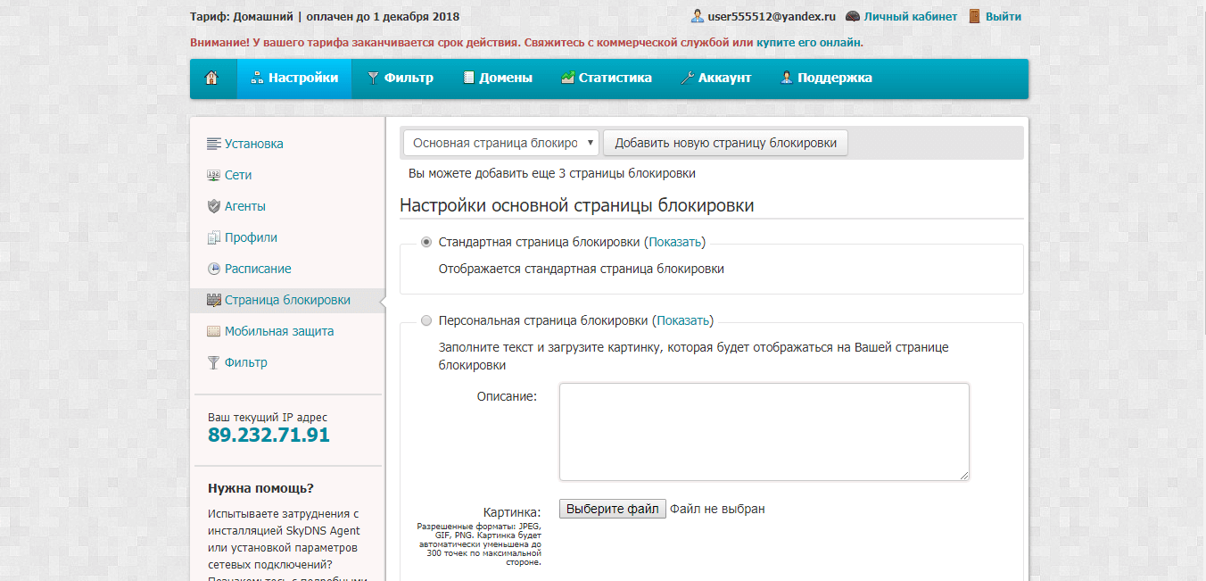 Внешний вид страницы блокировки. В подразделе “Страница блокировки” можно настроить свой вариант внешнего вида заблокированной страницы. Здесь доступны стандартный баннер предупреждения, или можно заполнить свой текст и загрузить картинку. Также можно включить эмуляцию ошибки сервера или просто поставить пустую страницу, будто бы сайта вообще не существует. Вот так выглядит стандартный вариант: