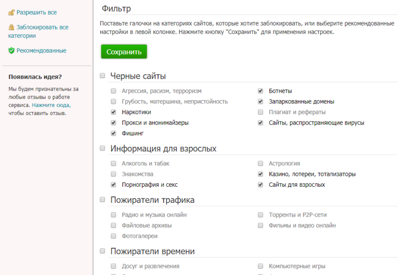 Блокировка сайтов по различным категориям. Для совершения в личном кабинете открываем в верхнем меню вкладку “Фильтр”. Здесь откроется список более 50 категорий сайтов всевозможной тематики: черные сайты, порнография, торренты, форумы и т.п. Отмечаем галочкой те группы сайтов, к которым вы бы хотели закрыть доступ со своих устройств.