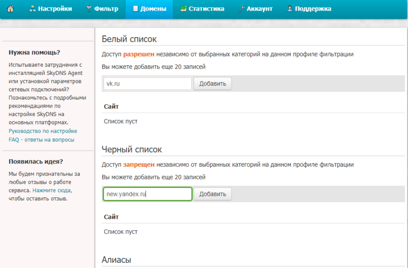 Добавление сайтов в два списка: черный и белый. Чтобы заблокировать отдельные сайты заходим в раздел “Домены”. Во вкладке “Черный список” вводим сайт, который нужно заблокировать. Для запрета доступа к интернет ресурсу нужно указывать адреса без WWW. Благодаря этому, также закроется доступ на все поддомены введенных сайтов. Таким образом, если вам нужно закрыть доступ на поддомен, то вводим только его. Например, если нужно закрыть доступ на news.yandex.ru, добавляем только данную ссылку. В поле ввода “Белого списка” вписываем домена сайтов, на которые будет открыт доступ независимо от того находится ли сайт в списке запрещенных категорий.