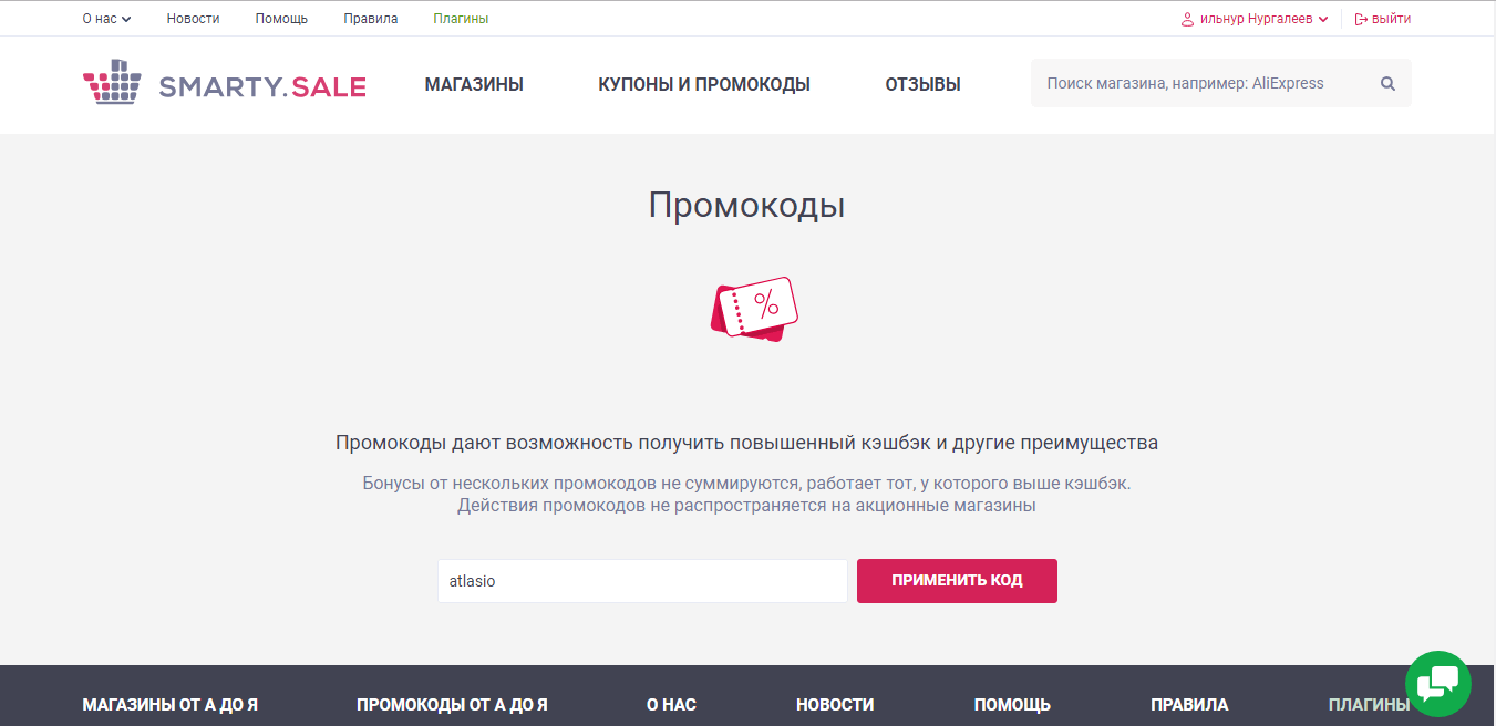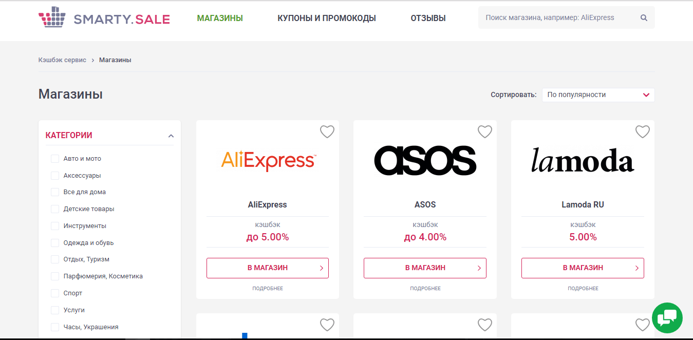 После нам откроется главная страница сайта, где представлен список популярных магазинов. А в шапке сайта можно перейти к каталогу магазинов, почитать отзывы, перейти к промокодам.