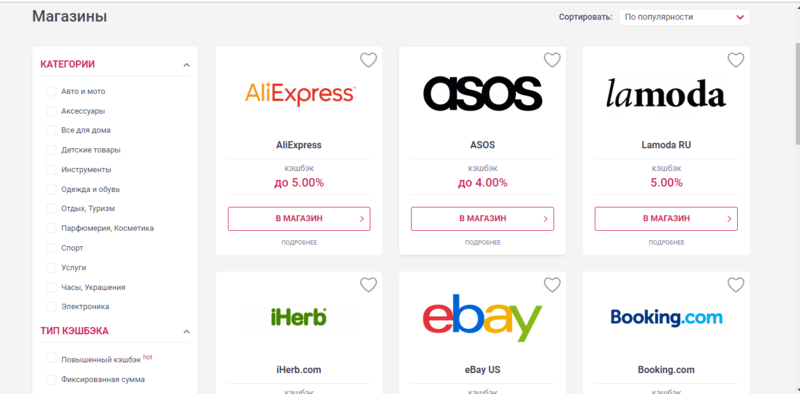 • Огромный каталог магазинов и выгодный кэшбэк по ним.