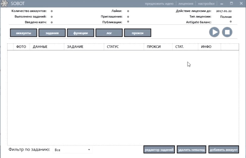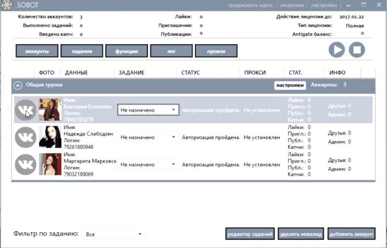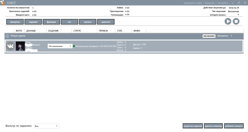 Основное предназначение Sobot - это работа с социальной сетью ВКонтакте, рассмотрим задачи, направленные на продвижение страниц и сообществ в этой сети.