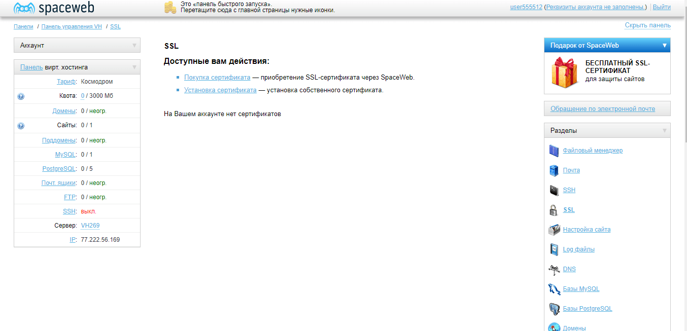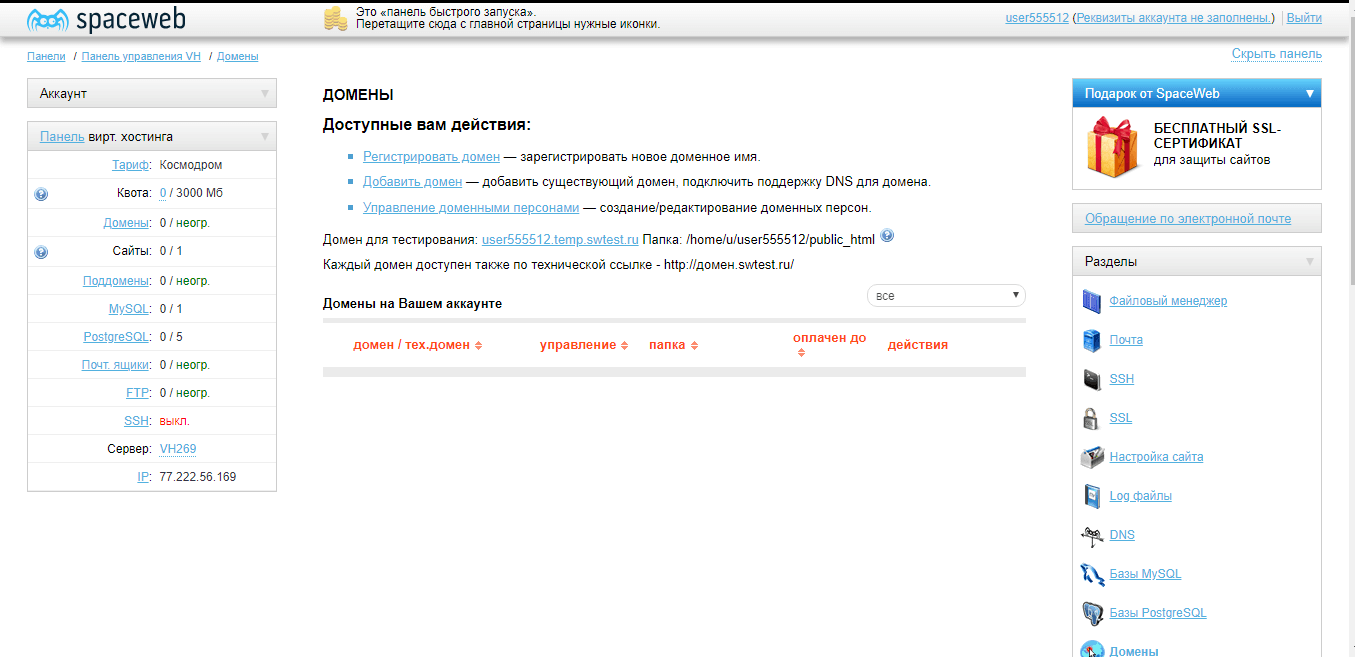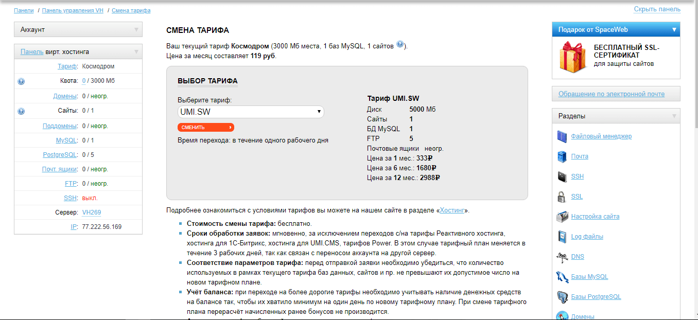 - «Ракета» стоимость на месяц составляет 339 рублей (при годовой подписке 279р. в месяц). План включает в себя 10 сайтов, 10 гигабайт выделенного пространства на диске, 2 бесплатных домена, неограниченное количество почтовых ящиков и «ФТП» аккаунтов, 10 баз данных и сертификат SSL;