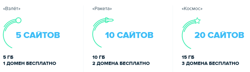 - «Взлет» стоимость на месяц составляет 199 рублей (при годовой подписке 159р.в месяц). План включает в себя 5 сайтов, 5 гигабайт выделенного пространства на диске, 1 бесплатный домен, неограниченное количество почтовых ящиков и «ФТП» аккаунтов, 5 баз данных и сертификат SSL;