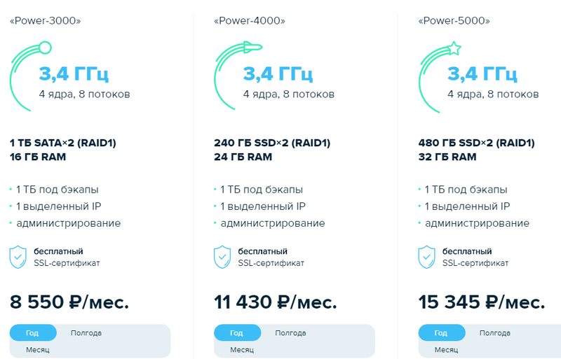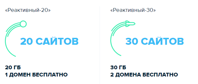 - «Реактивный-30» стоимость на месяц составляет 1849 рублей (при годовой подписке 1479р.в месяц). План включает в себя 30 сайтов, 30 гигабайт выделенного пространства на диске, 2 бесплатных домена, неограниченное количество почтовых ящиков и «ФТП» аккаунтов, 30 баз данных и сертификат SSL.