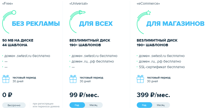 Конструктов собственных сайтов – сервис предлагает три тарифных плана для создания собственных сайтов по заданным шаблонам (от 44 до 190+ шаблонов).