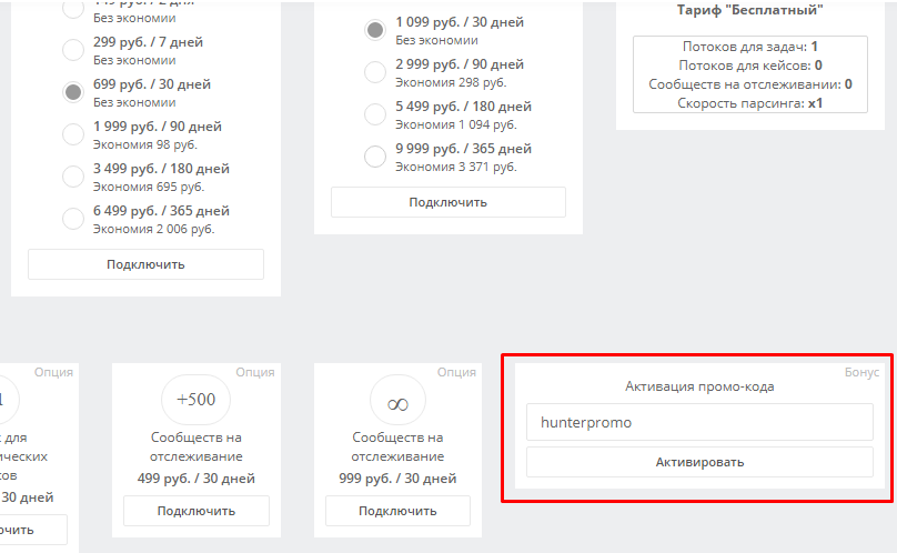 Тариф «Бесплатно» имеет массу ограничений и доступны всего 20 функций, ограничений по времени пользования нет. Для знакомства с сервисом этот тариф вполне подходит.