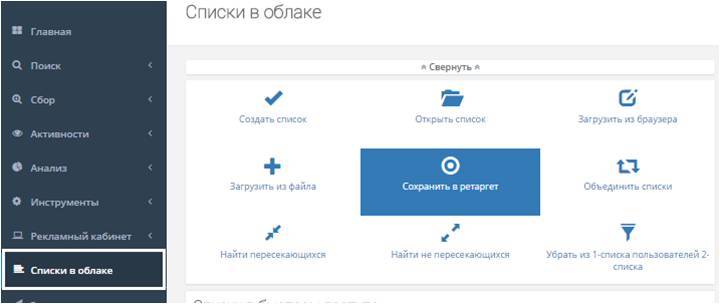 Здесь же можно создавать базы ретаргетинга и применять к ним разный функционал.