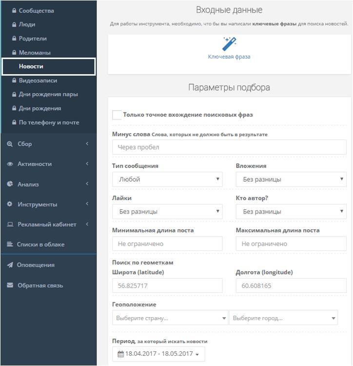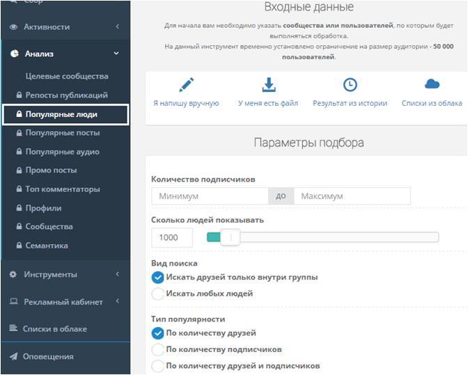 Эта функция поможет найти новых вступивших пользователей в указанные вами сообщества. Таким образом вы сможете отследить новых вступивших в вашу группу людей и сделать им выгодное предложение, или отследить новых потенциальных клиентов ваших конкурентов. - «Сообщества»