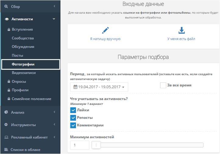 Позволяет выявить людей, которые проявляют активность (лайк, репост, комментарий) в заданных обсуждениях/постах/фотографиях или фотоальбомах/видеозаписях/профилях.