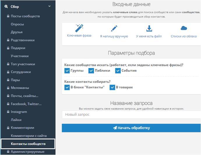 Вы задаете список сообществ или ключевые фразы, по которым будут искать сообщества, в результате получите пользователей, которые указаны как контакты.