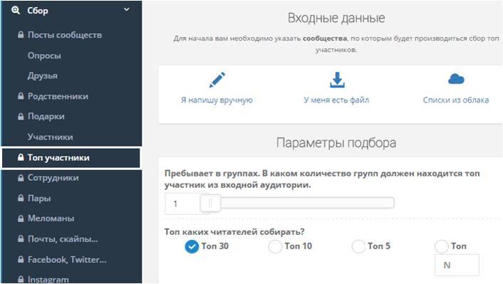 Собираются аккаунты людей, которые состоят сразу в нескольких группах. Таким образом, можно найти людей, которые интересуются чем-то конкретным, например, здоровой едой, фитнесом. - «Топ участники»