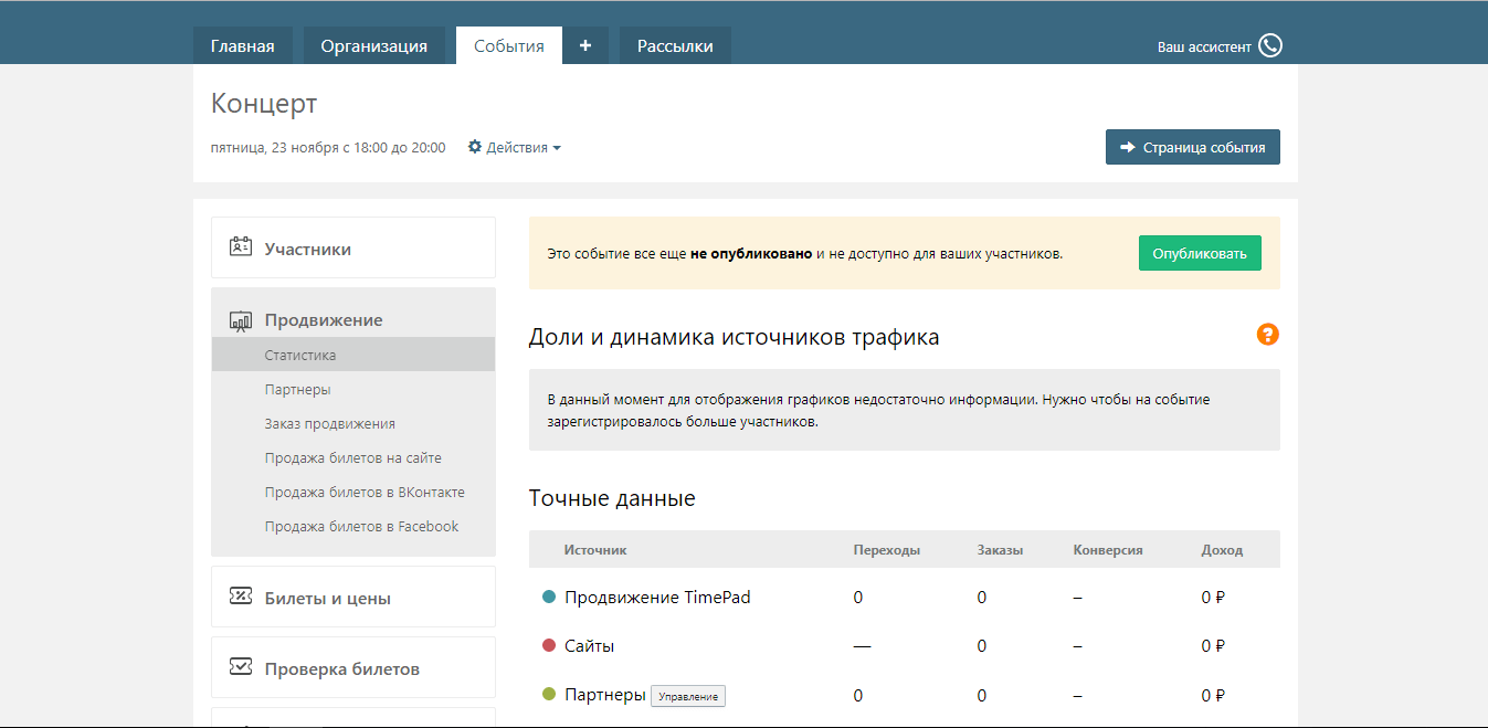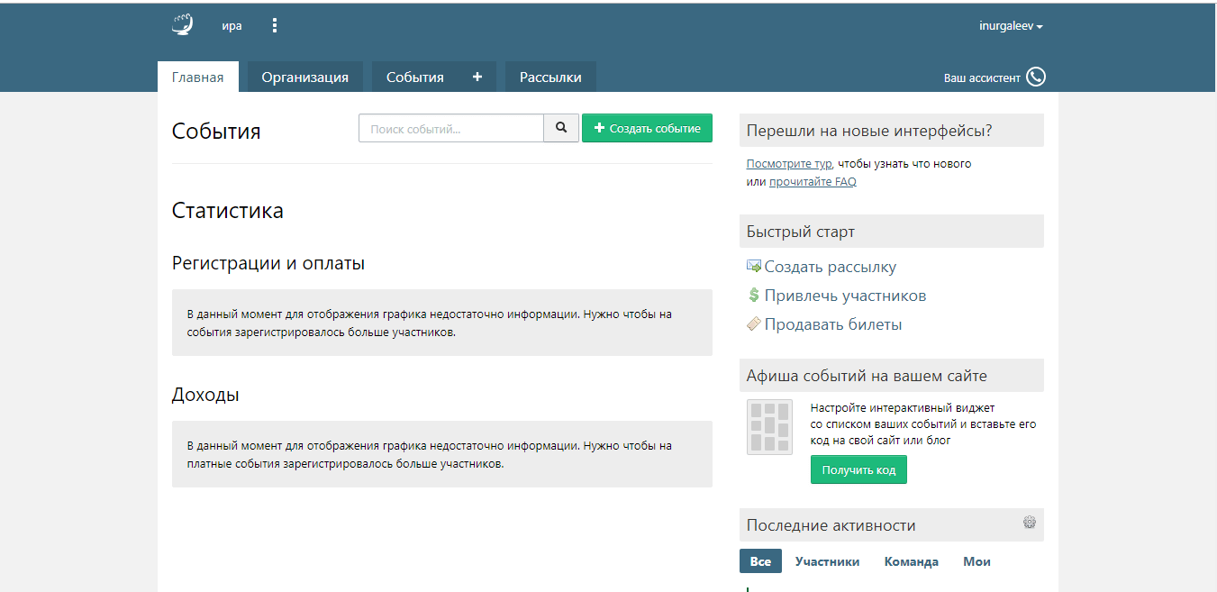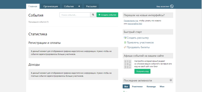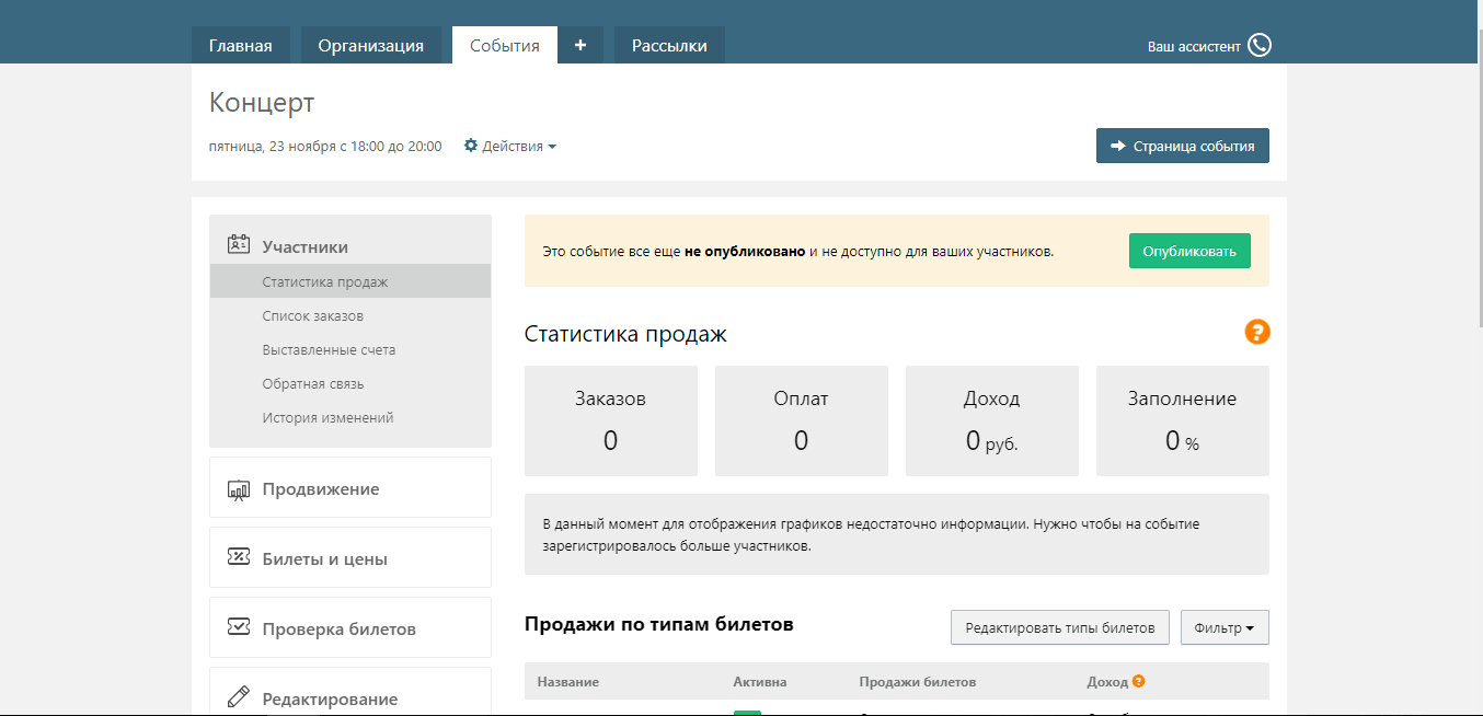 Теперь мы в своём личном кабинете организатора. Здесь вы увидите все активные события, статистику продаж и своих организаторов, которых вы можете подключить к своему кабинету. И вы в любой момент можете связаться со своим персональным ассистентом по кнопке сверху.