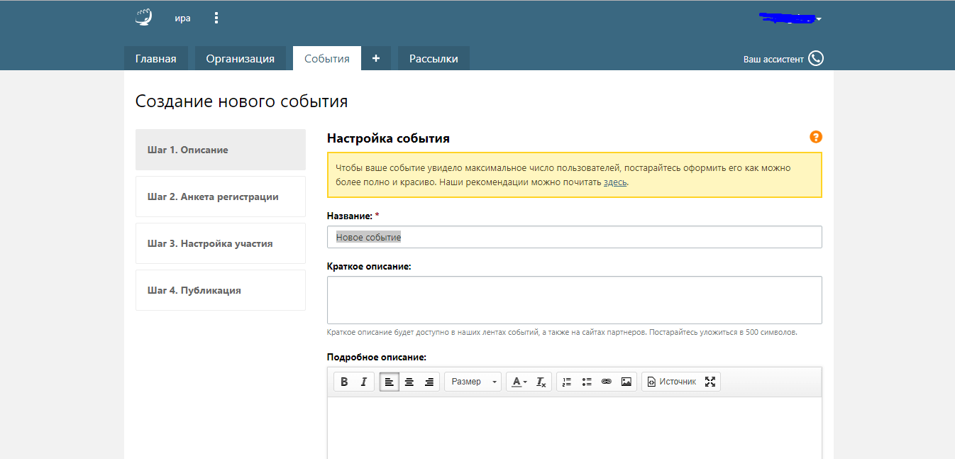Теперь начинаем создавать свое мероприятие, для этого переходим по вкладке “Создать событие”. В новом окне необходимо будет ввести информацию об вашей организации, чтобы получить свой личный кабинет, откуда вы сможете создавать новые события и управлять ими. Заполняем название организации, сайт и телефонный номер.