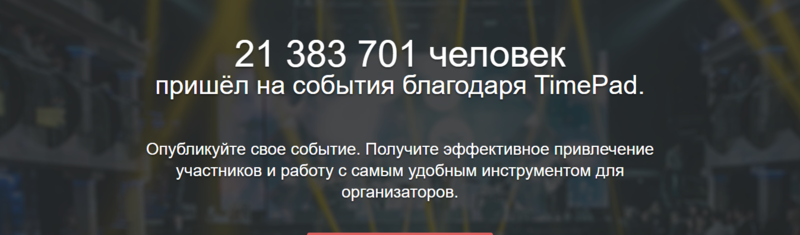 TimePad - это сервис, предназначенный для организации мероприятий и для продажи виртуальных билетов. Официальный запуск произошёл в июле 2009 года. Платформа может организовывать действия самых разных видов и размеров. Качество, легкость и удобство TimePad уже оценили Высшая школа экономики, Институт «Стрелка», Oracle, Центр фотографии имени братьев Люмьер, лекторий Политехнического музея и еще более 40 тысяч организаций. Ежемесячно 250 000 людей и больше заходят на сайт площадки и участвуют в разнообразных ивентах.