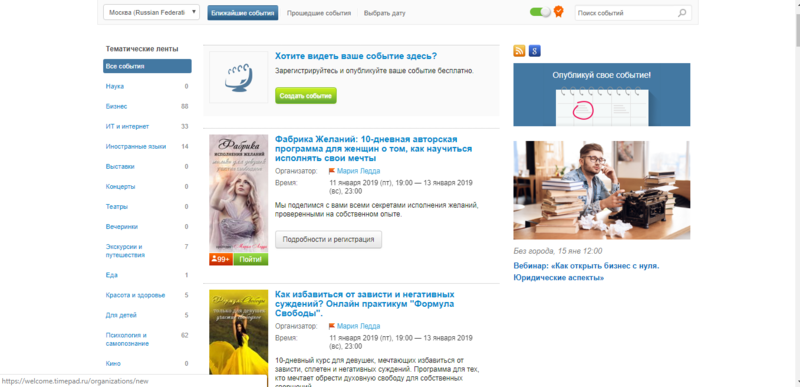Первым делом проходим быструю регистрацию на сайте площадки или заходим при помощи аккаунтов социальных сетей ВКонтакте, Facebook и Twitter. После этого выбираем свой город и, нам сразу же показывают ближайшие события. Все они разделены по тематике, и вы можете выбрать любую дату.