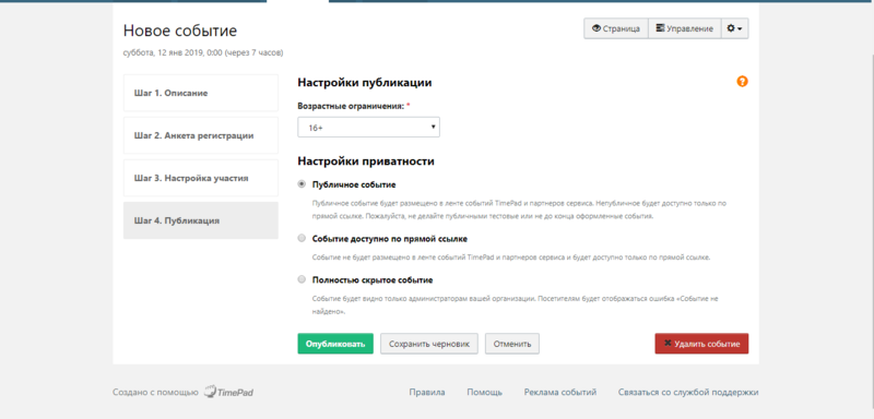 - И заключительный этап, в котором нужно ввести возрастные ограничения и настроить приватность мероприятия.