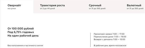 Банк также предлагает 4 программы стандартных депозитов-вкладов. Минимальная сумма вклада - 100 тыс. руб., срок вклада - от 1 дня до 1 года. Процент ставки зависит от срока.