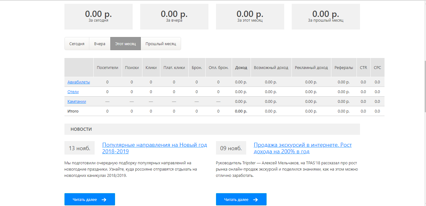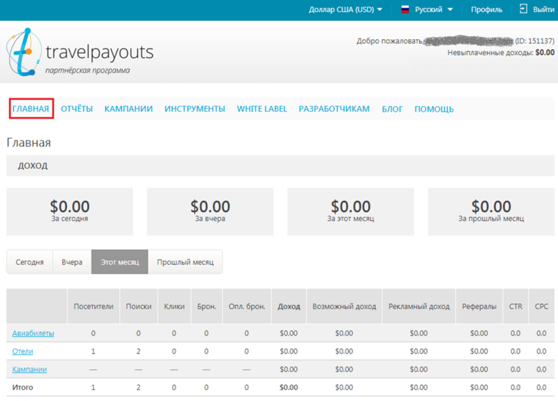 После регистрации вы попадете на главной странице личного кабинета, где можно наблюдать за сводным отчетом по доходам за сегодня/вчера/текущий месяц/прошлый месяц.