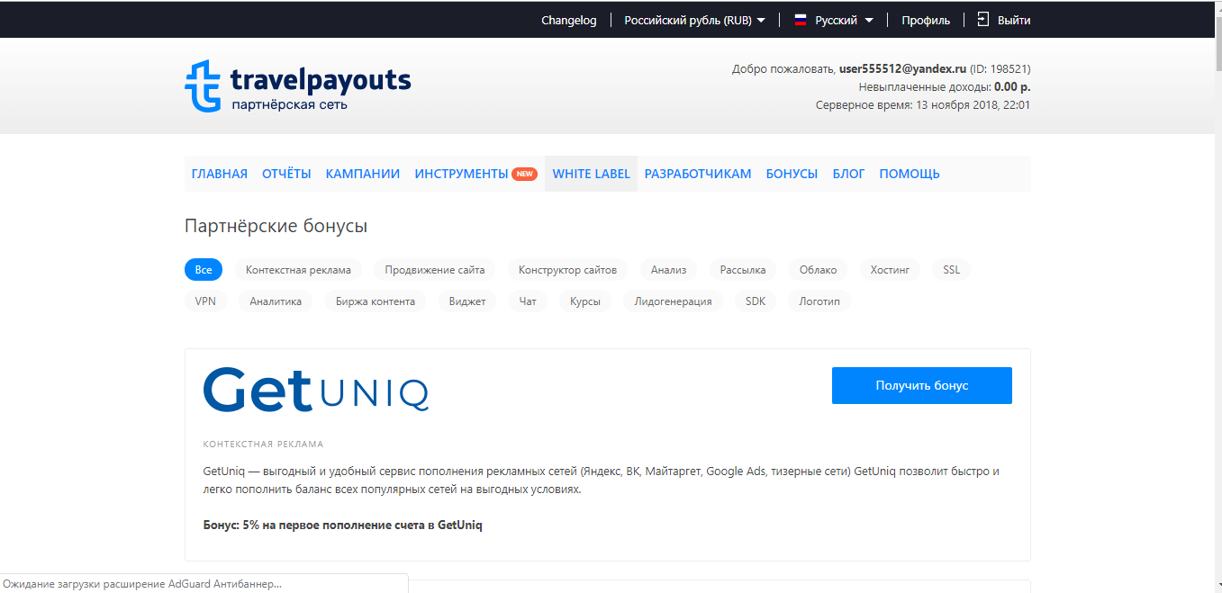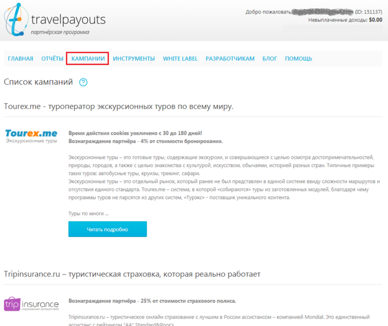 Помимо главных партнеров, программа работает и с туристическими продуктов от сторонних рекламодателей. Найти предложения можно во вкладке «Кампании».