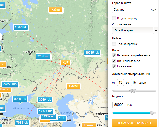 - Виджет карты – интерактивная карта со схемой рейсов из города, в котором находится пользователь. Кликнув по карте, пользователь будет перенаправлен на сайт map.aviasales.ru.