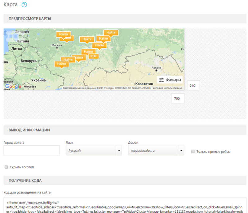 Можно самостоятельно задать ширину и высоту виджета, указать город вылета, который будет стоять по умолчанию. После чего будет сгенерирован код виджета для размещения на вашем сайте.