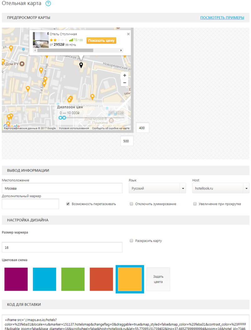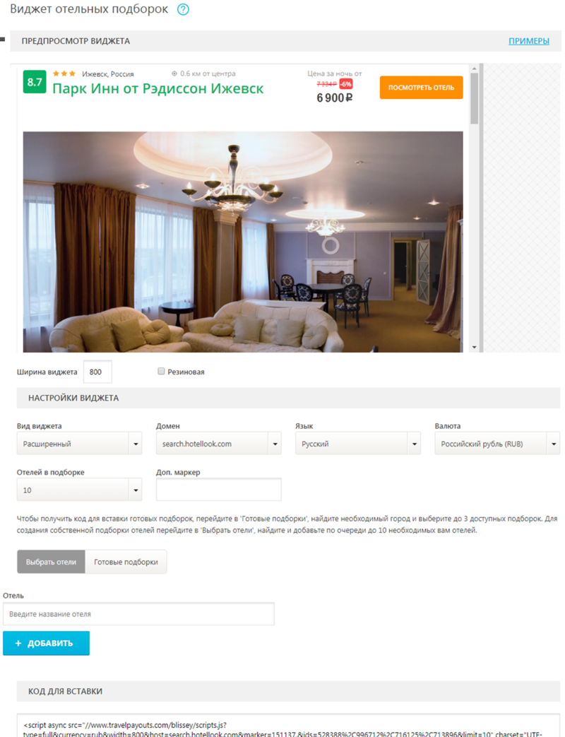 В настройках вы указываете ширину виджета, отель, валюту, язык и маркер (для удобства ведения статистики трафика).