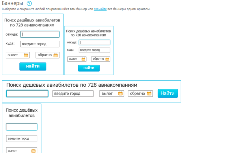 После вам предоставляются коды виджета поиска/календаря/тизера, множества баннеров, ссылок на скачивание приложений и код для генерации ссылок, которые вы сможете разместить на своем сайте.