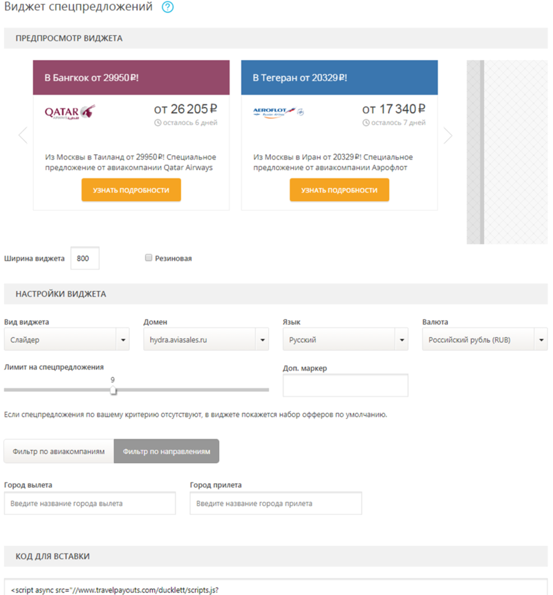 Вы указываете вид виджета (плитка/слайдер), валюту, язык, лимит на спецпредложения и домен, на который бед перенаправлен пользователь (hydra.aviasales.ru), и задаете будет ли виджет показывать спецпредложения по авиакомпаниям или городам.