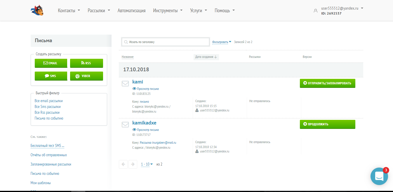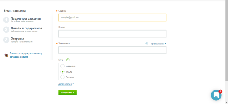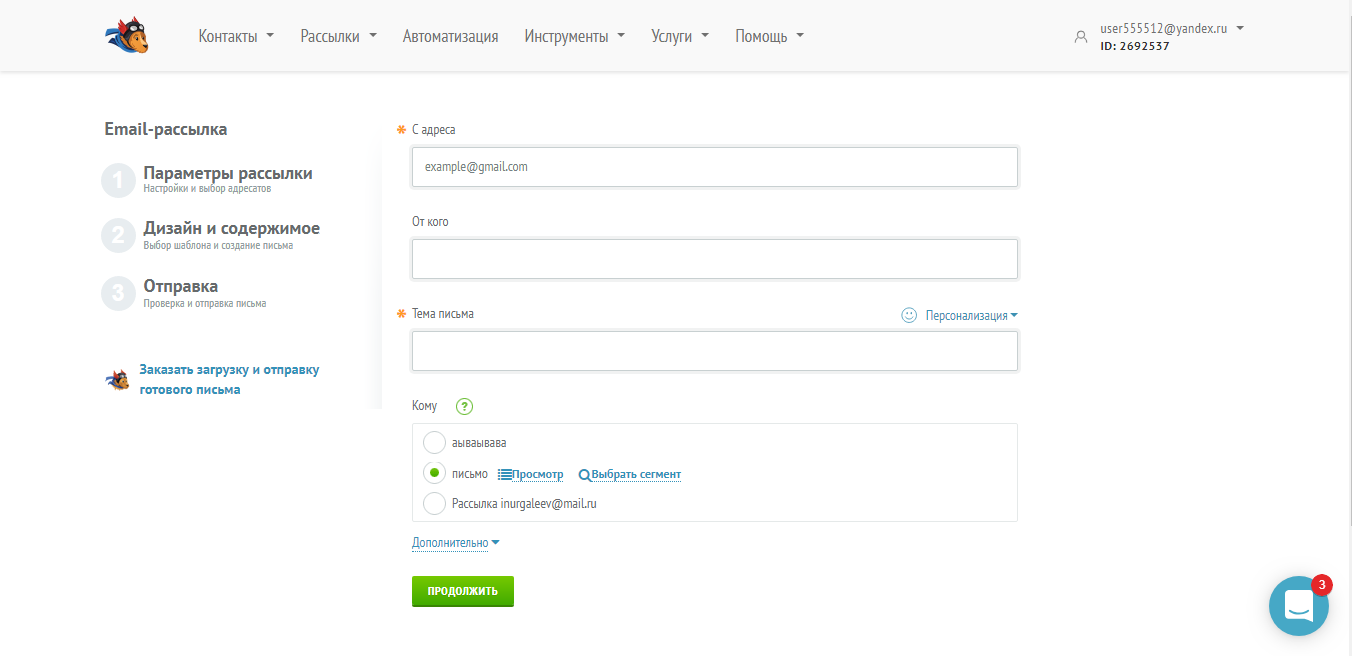 Дальше создаем саму рассылку писем, для этого переходим по иконке “Создать письмо” в центре сайта или через боковое меню. Здесь вам будет необходимо заполнить все необходимые поля и выбрать базу данных, куда будет отправляться письмо.
