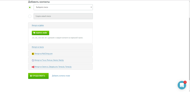 Загружаем базу данных в форматах csv, xls, xlsx, txt или заполняем все вручную. Также можно импортировать контакты из других сервисов или сайтов: MailChimp.com, Tiu.ru, Pro.ua и др.