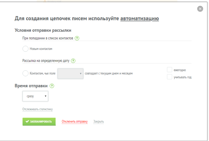 Нажимаем продолжить и выбираем время отправки писем: отправка писем новым контактам, отправить письма сразу или запланировать дату отправки.