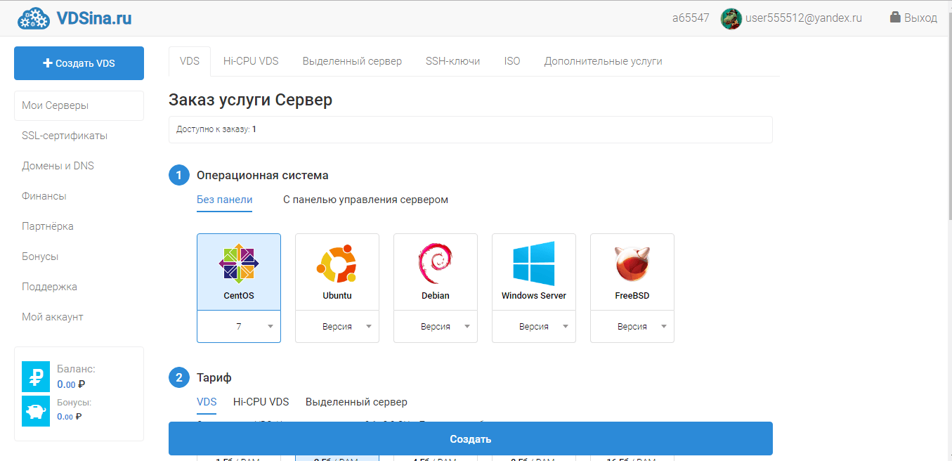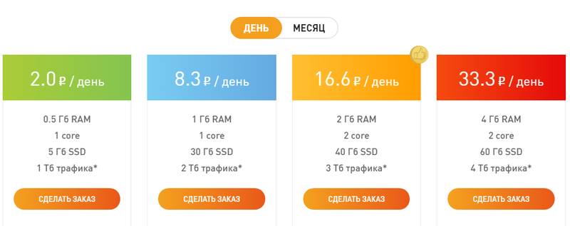 - 1 – стоимость 59 рублей в месяц, включает 500 мегабайт ОЗУ, работа на одноядерном процессоре, 5 гб выделенного пространства на «ССД» диске, до 1 терабайта трафика;