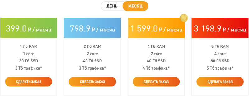 - 4 – стоимость 999 рублей на месяц, ОЗУ 4 гб, двуядерный процессор, 60 гигабайт пространства на «ССД» диске, 4 терабайта трафика.