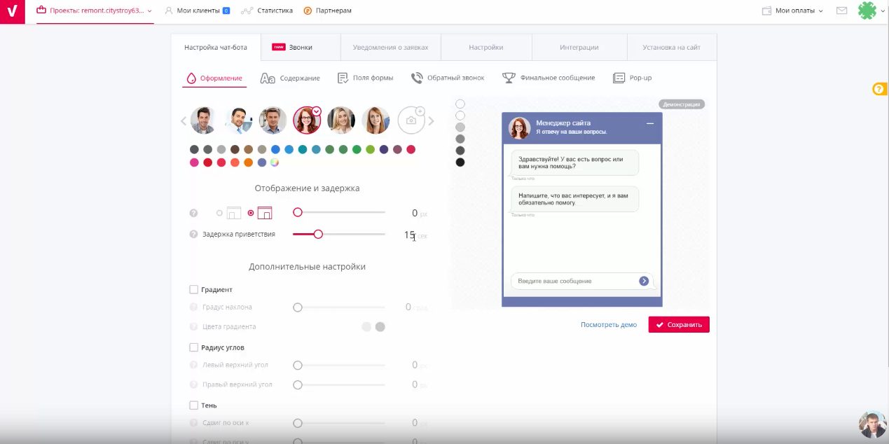Настройка виджета сильно облегчается тем обстоятельством, что помощь оказывают квалифицированные специалисты маркетингового отдела. Есть возможность подстройки его, к примеру, под сбыт объектов недвижимости. Благодаря готовым решениям облегчается настройка под нужное направление деятельности. Обеспечивается рост конверсии сайта на 15%, покупатели и продажи в короткий срок прирастут на 30%. Бизнес-помощник облегчает выполнение и ряда других задач, о его возможностях готовы рассказать консультанты.