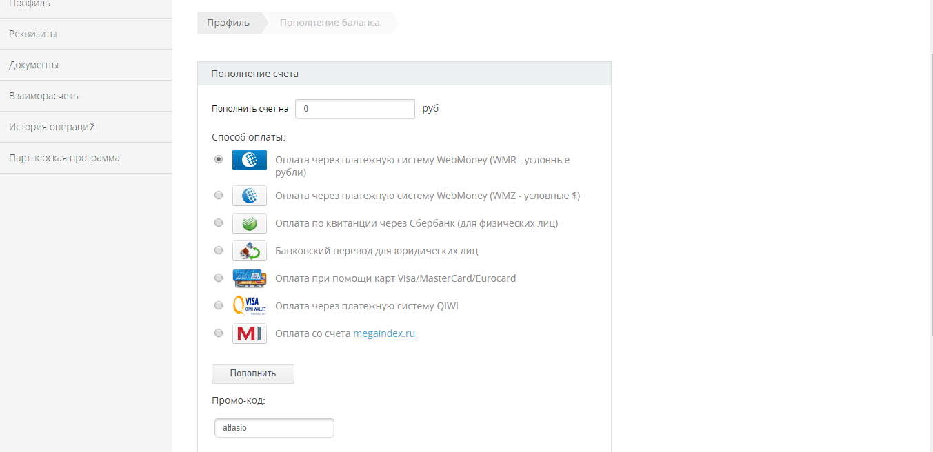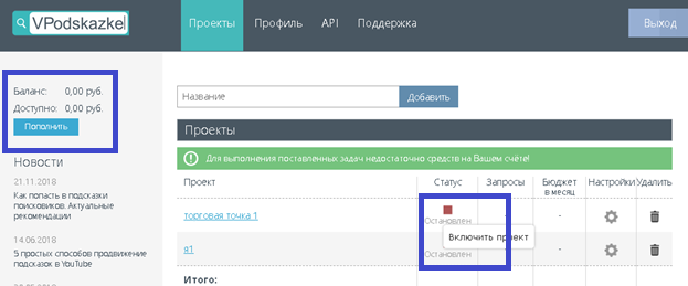 Закончив настройку проекта, нужно будет его активировать, но для этого изначально придется пополнить баланс в своем профиле. Сервис предлагает пополнение счета через наиболее популярные и проверенные платежные системы: