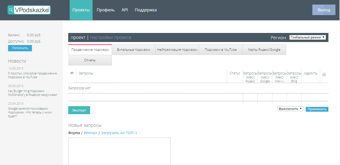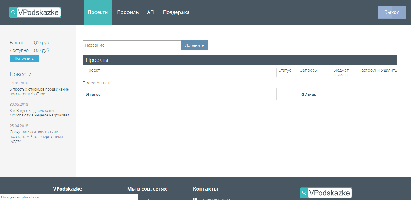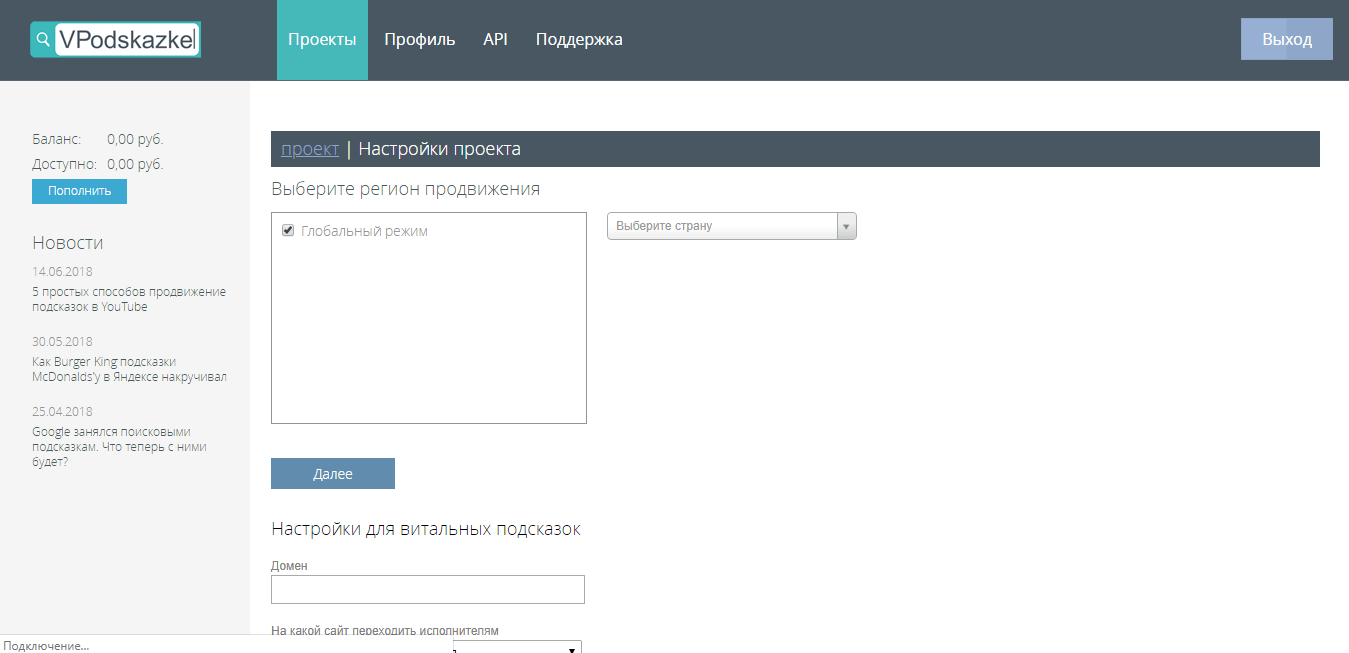 Платформа «Vpodskazke» была создана в сентябре 2014 года, разработчики преследовали цель – создать сервис, который будет помогать людям продвигать свои интернет ресурсы, через их размещение в подсказках поисковых систем. Такой подход поможет существенно нарастить трафик на необходимом сайте. Платформа имеет достаточно удобный и практичный интерфейс, с обширным рабочим функционалом.