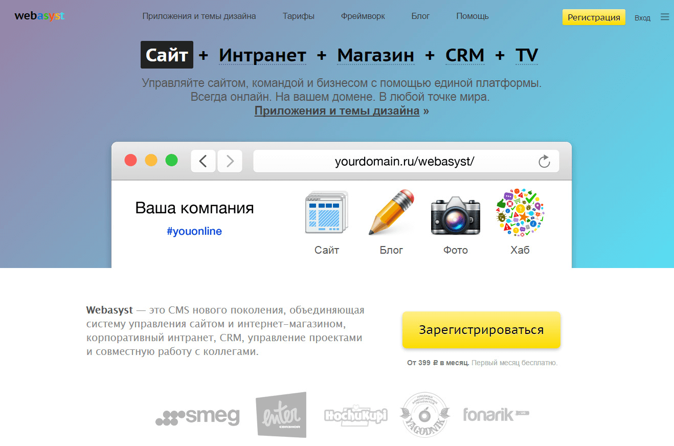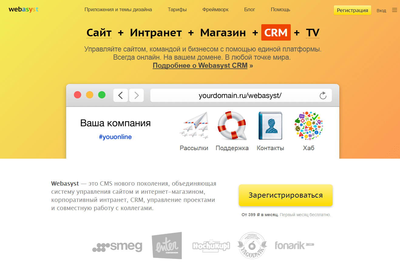 webasyst.ru примечателен тем, что пользователь обретает полный контроль данных и скриптов на сервере; платформа проработана настолько четко, что вы не потеряете лишнего времени на ее освоение. Впрочем, если совсем нет возможности уделять его на обучение, вы всегда можете получить помощь экспертов.
